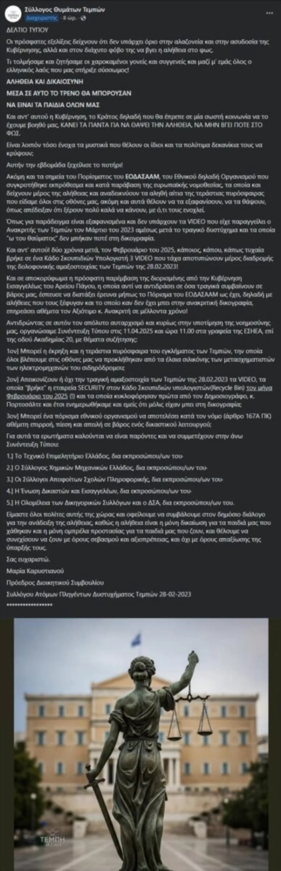 Το δελτίου Τύπου της «μάνας των Τεμπών», το οποίο δημοσιεύτηκε στο επίσημο προφίλ του Συλλόγου Συγγενών Θυμάτων Τεμπών 2023 στο Facebook, έχει ως ακολούθως: