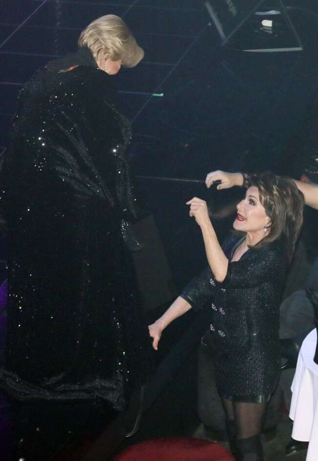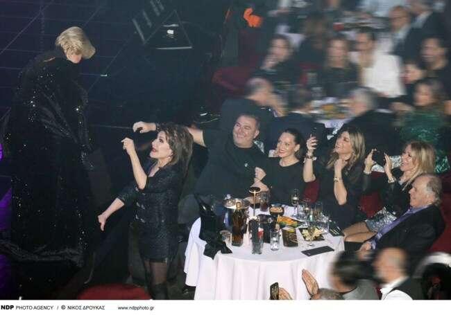 Μάλιστα, η σύζυγος του Θόδωρου Αγγελόπουλου σηκώθηκε και χόρεψε τσιφτετέλι και η Μαρινέλλα την χαιρέτησε από τη σκηνή.