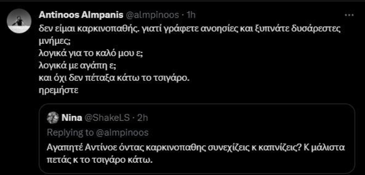Λογικά για το καλό μου ε; Λογικά με αγάπη ε; Και όχι δεν πέταξα κάτω το τσιγάρο. Ηρεμήστε», απάντησε ο Αντίνοος Αλμπάνης.