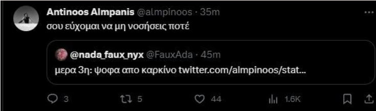 Ένα από τα σχόλια που έλαβε ήταν: «Αγαπητέ Αντίνοε όντας καρκινοπαθής συνεχίζεις και καπνίζεις? Και μάλιστα πετάς και το τσιγάρο κάτω».