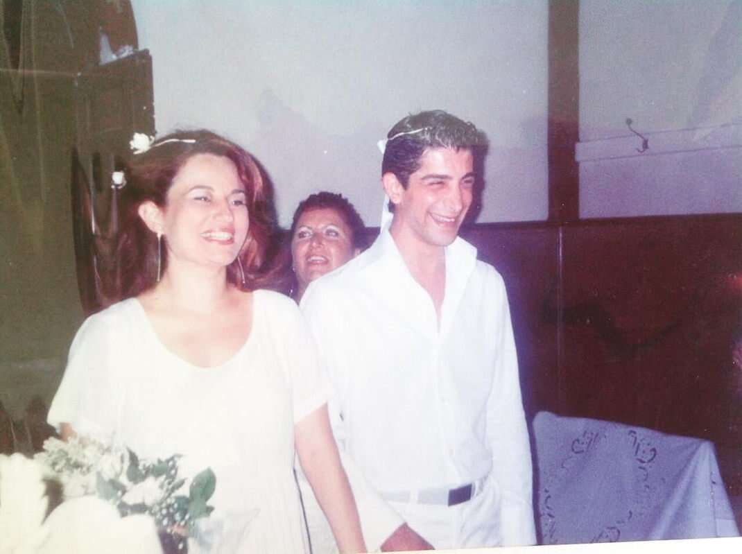 «Σε ένα μικρό εκκλησάκι,στα Βάτσα Κεφαλονιάς. Μόνο εσύ κι εγώ. Τρεις ψάλτες που μετά γίνανε οι κανταδόροι μας, δυο αγαπημένοι μας άνθρωποι που μας άλλαξαν τα στέφανα και τις βέρες, η Πίτσα (σσ. Κουτουφά) και ο Φωκάς (σσ. Ευαγγελινός) και που οργάνωσαν όλο αυτό τον παραμυθένιο γάμο χωρίς να πάρουμε χαμπάρι.