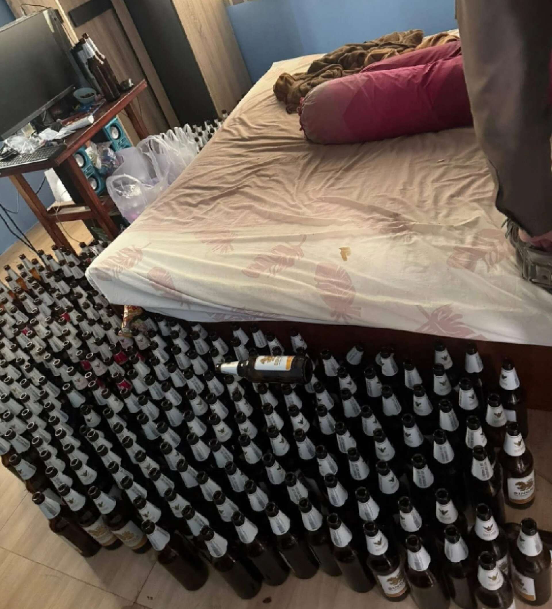 Η εικόνα του δωματίου πάγωσε ακόμα και τους πιο έμπειρους διασώστες. Περισσότερα από 100 άδεια μπουκάλια μπύρας ήταν τοποθετημένα προσεκτικά στο πάτωμα, σχηματίζοντας ένα στενό μονοπάτι που οδηγούσε στο κρεβάτι του.