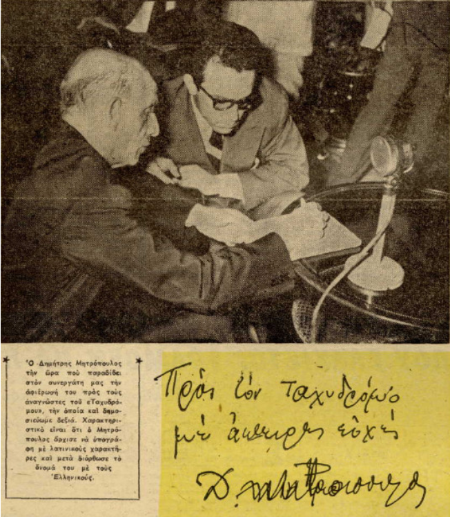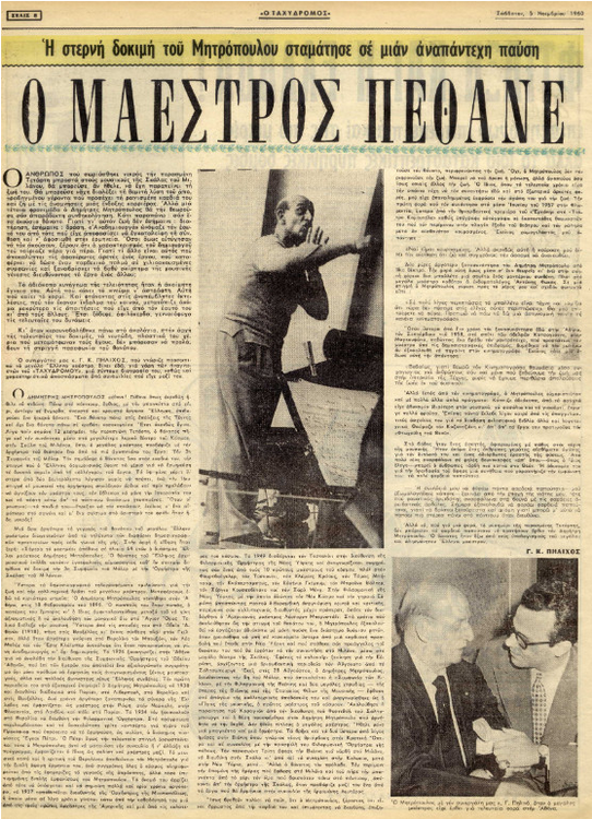 Στο τεύχος του «Ταχυδρόμου» που είχε κυκλοφορήσει τρεις μόλις ημέρες μετά το θάνατο του Δημήτρη Μητρόπουλου, το Σάββατο 5 Νοεμβρίου 1960, υπήρχε ένα πολύ ενδιαφέρον άρθρο για τον εκλιπόντα αρχιμουσικό, που έφερε τον τίτλο «Ο μαέστρος πέθανε».