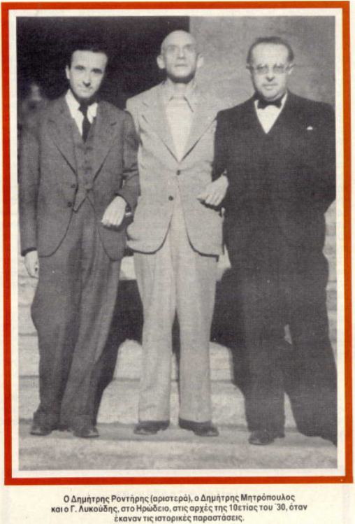 *Στην κεντρική φωτογραφία του παρόντος άρθρου, ο Δημήτρης Μητρόπουλος το 1935. Η αφιερωμένη από τον ίδιον στον «αδελφό» του Μήτσο (Δημήτρη) Ροντήρη φωτογραφία προέρχεται από τον «Ταχυδρόμο» που είχε κυκλοφορήσει στις 14 Φεβρουαρίου 1985.