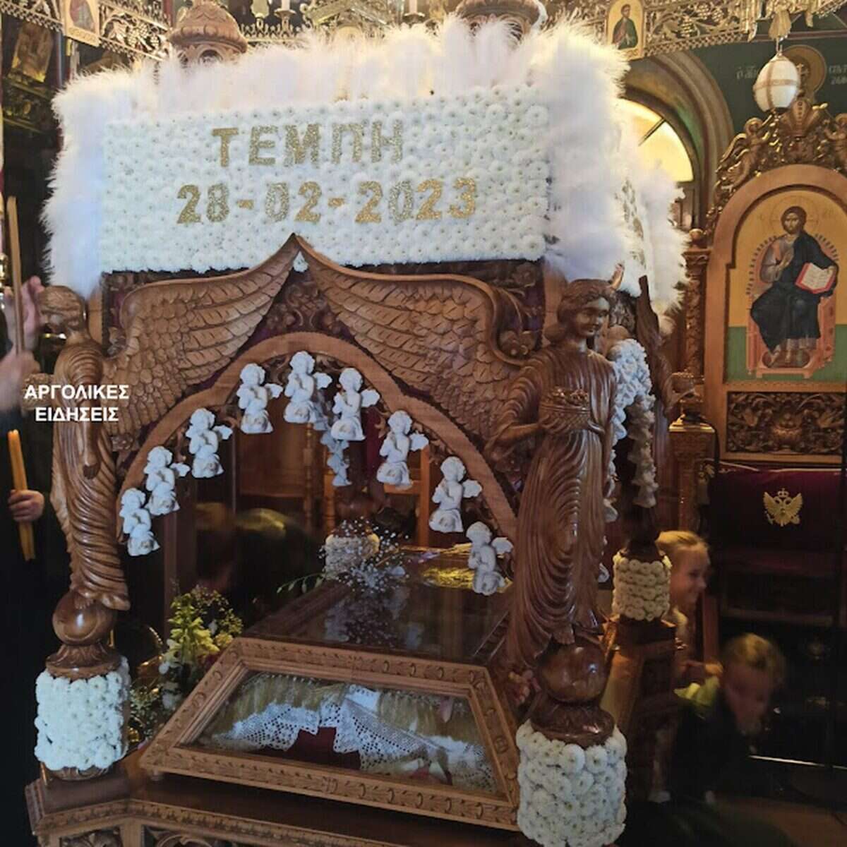 Όπως αναφέρει το argolikeseidhseis.gr, οι εθελόντριες στόλισαν τον επιτάφιο με περισσή αγάπη γράφοντας ΤΕΜΠΗ 28/2/2023 τον στόλισαν με λευκά άνθη και τον διακόσμησαν με 57 μικρά λευκά αγγελάκια με τα ονόματα των θυμάτων και έναν μεγάλο άγγελο για τους αγνοούμενους της τραγωδίας που συγκλόνισε το πανελλήνιο.