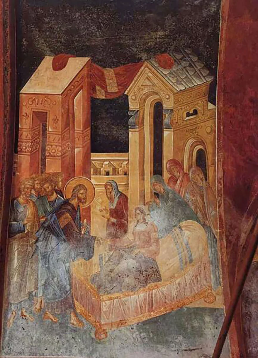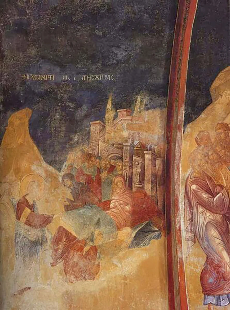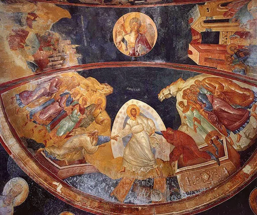 Σύμφωνο με το νεκρικό προορισμό του χώρου είναι και το εικονογραφικό του πρόγραμμα. Μία επιβλητική σύνθεση της Καθόδου του Χριστού στον Άδη διακοσμεί την αψίδα, ενώ μία μνημειακή παράσταση της Δευτέρας Παρουσίας καλύπτει τα ψηλότερα μέρη του ανατολικού τμήματος. Οι δύο παραστάσεις από τα Θαύματα του Κυρίου, η ανάσταση του γιου της χήρας και της κόρης του Ιαείρου, ολοκληρώνουν το πρόγραμμα του ανατολικού τμήματος του παρεκκλησίου, που συνολικά εκφράζει τον Θρίαμβο του Χριστού πάνω στον θάνατο.