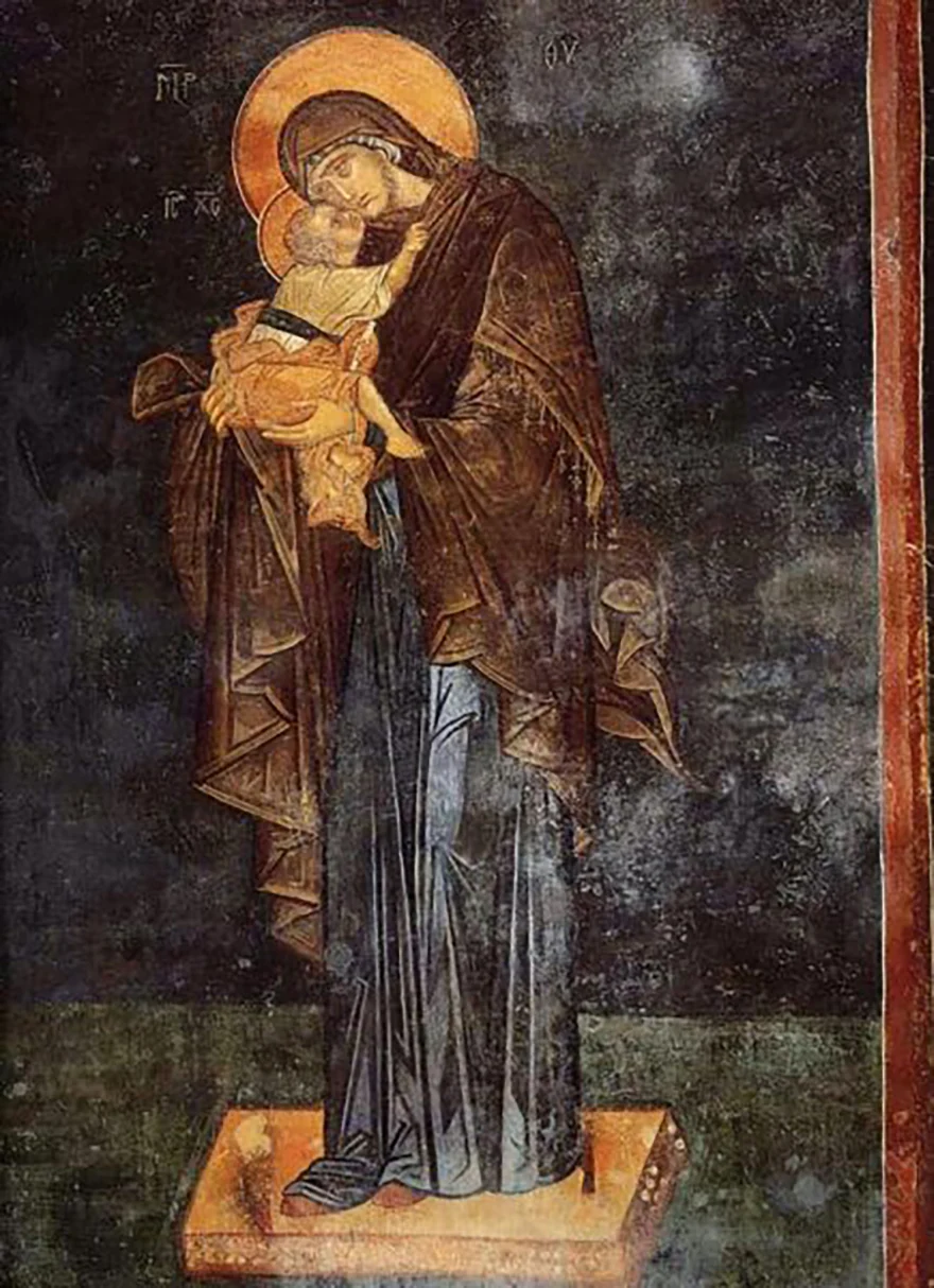 Στη διακόσμηση της κάτω ζώνης της αψίδας του παρεκκλησίου απεικονίστηκε και η ολόσωμη Παναγία που τραβά με τα χέρια προς το μάγουλό της το Θείο Βρέφος και χαρακτηρίζεται «ένας από τους πιο συναισθηματικούς τύπους της Παναγίας Ελεούσας στη βυζαντινή τέχνη».