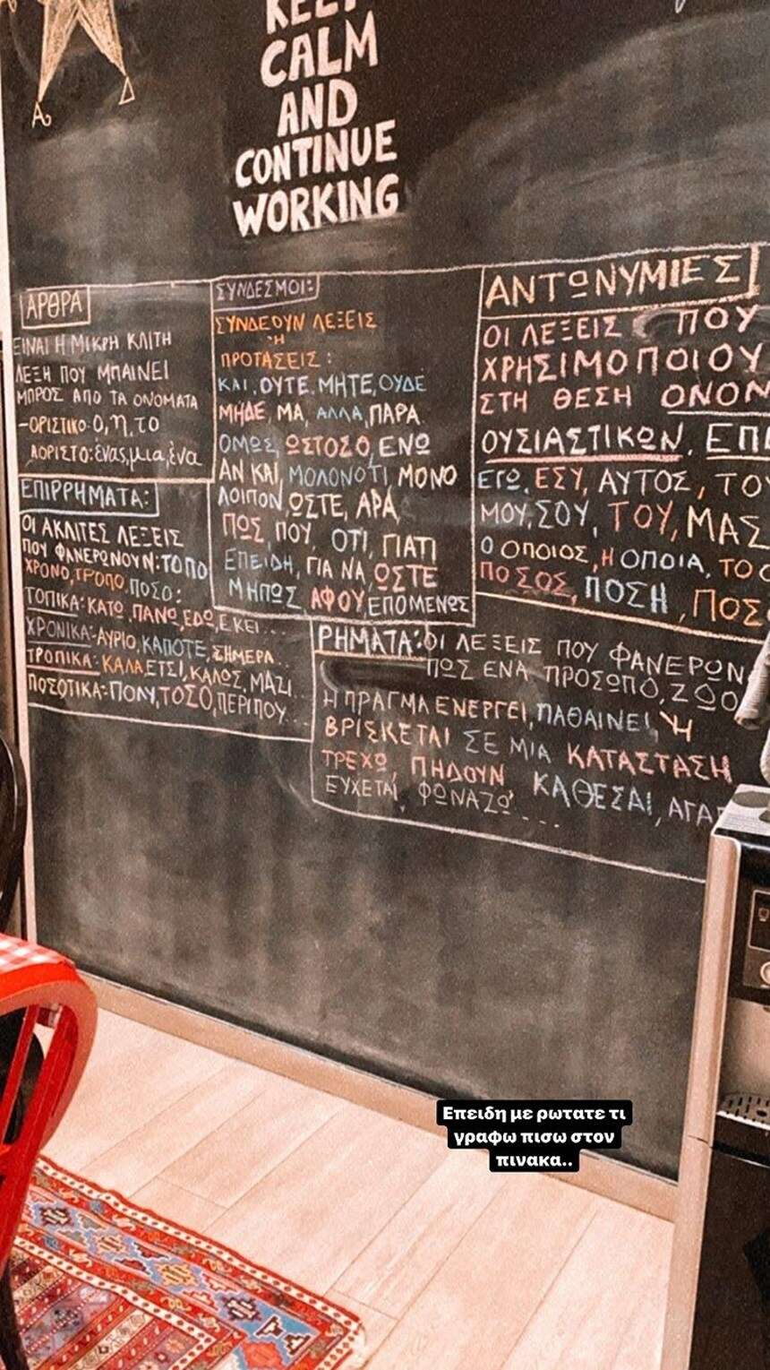 Όπως αποκάλυψε η Ολυμπία Χοψονίδου μέσα από ένα instastory, το εργαλείο που «έλυσε» τα χέρια της είναι ένας μαύρος τοίχος στο σπίτι της, πάνω στον οποίο έχει σημειώσει διάφορους γραμματικούς κανόνες, για να μην είναι απαραίτητη η φυσική παρουσία της κατά τη μελέτη τους.