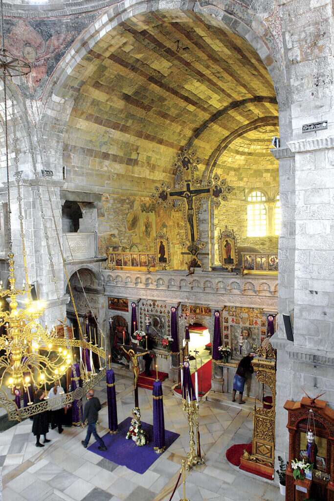 Ο μεγάλος Ναός και η Εκκλησία του Αγίου Νικολάου έχουν σύνθρονο. Το σύνθρονο έχει τη μορφή μικρού αρχαίου θεάτρου και στη μέση της πάνω σειράς των εδωλίων εξαίρεται ο θρόνος του Επισκόπου. Η Αγία Τράπεζα του Ναού περιβάλλει και σκεπάζει ένα ενδιαφέρον αρχιτεκτονικό κατασκεύασμα, που ονομάζεται κιβώριο, που μοιάζει με Κουβούκλιο.