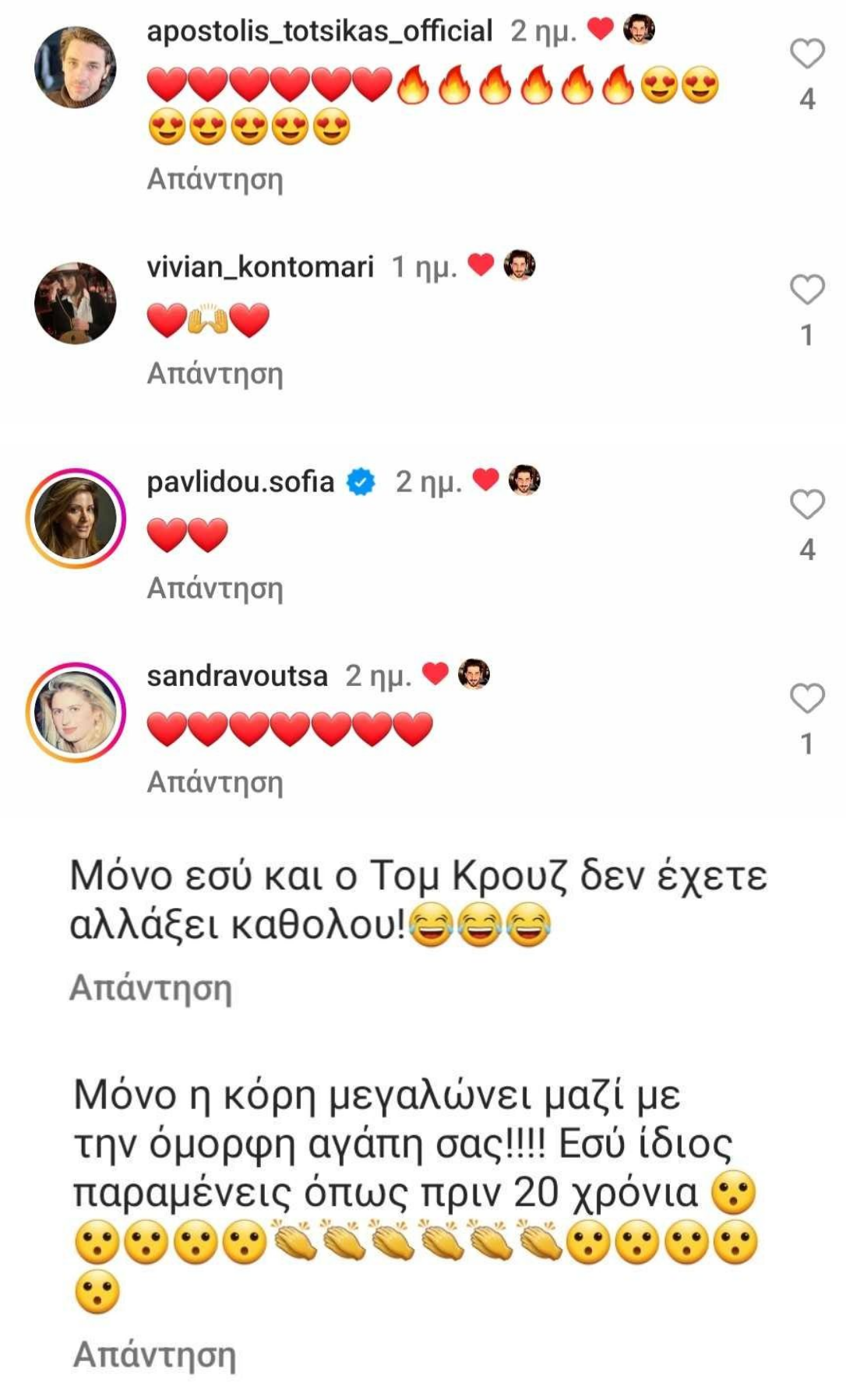 Φυσικά η ανάρτηση αυτή συγκέντρωσε πολλά likes και σχόλια, με πολλούς συναδέλφους –αλλά και μη– του ηθοποιού να σχολιάζουν με emojis σε σχήμα καρδούλας.