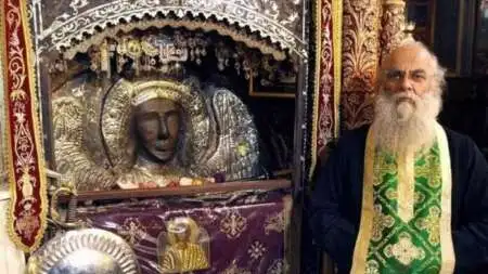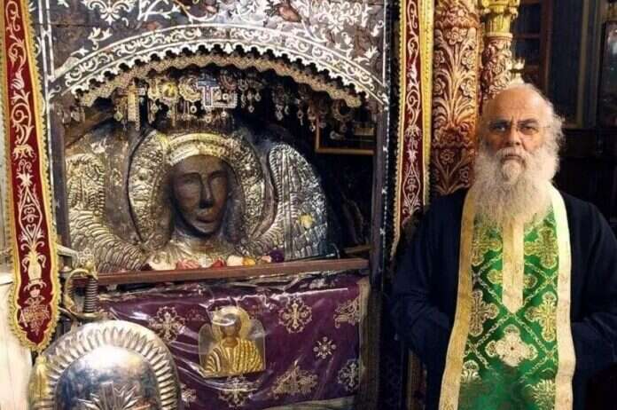Και συνέχισε: «Το τζάμι που βρίσκεται σήμερα μπροστά από την εικόνα τοποθετήθηκε περίπου προ 20 χρόνια όταν διάφοροι επιτήδειοι βεβήλωναν την ιερή εικόνα ξύνοντας τμήματά της για να τα πάρουν μαζί τους ως κειμήλιο και φυλαχτό ή ακόμα και να τα προωθήσουν για εργαστηριακές αναλύσεις, ώστε να διαπιστώσουν αν πραγματικά είναι από πηλό και αίμα ανθρώπων».