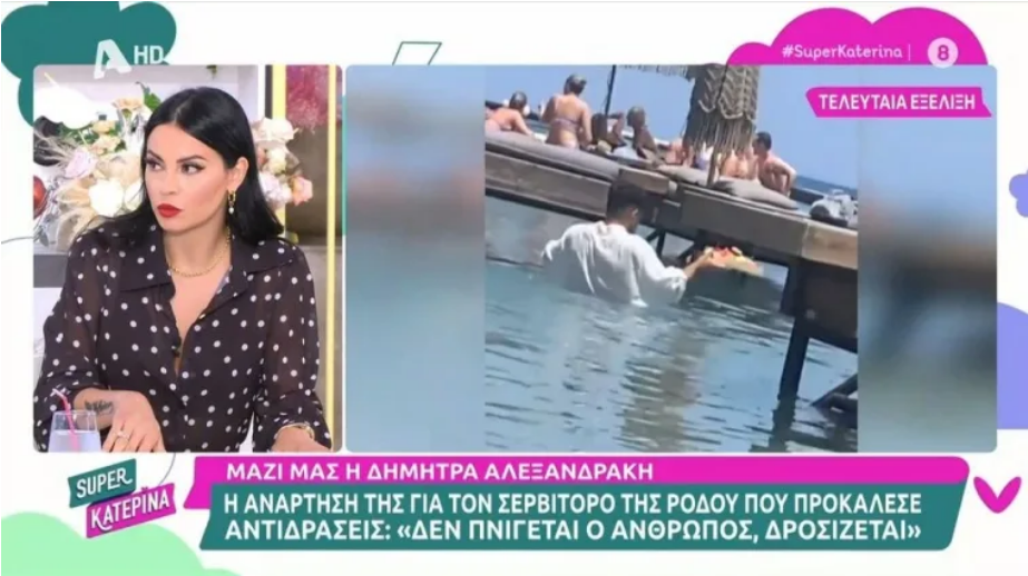 Η Δήμητρα Αλεξανδράκη αποφάσισε να επανατοποθετηθεί για την εικόνα του σερβιτόρου στη Ρόδο. Να υπενθυμίσουμε πως ο νεαρός διασχίζει το νερό της θάλασσας προκειμένου να παραδώσει την παραγγελία στα τραπέζια του μαγαζιού που “κολυμπούσαν” στη θάλασσα.