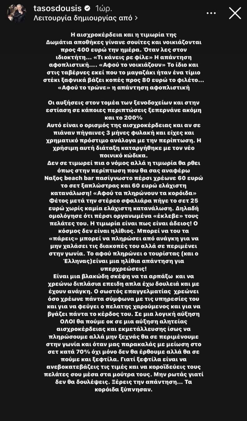 Όπως είναι φανερό, αλλά έχει γίνει ήδη γνωστό και από επίσημα χείλη, ο τουρισμός καταρρέει σε δημοφιλείς προορισμούς και ο Τάσος Δούσης, με νέο ξέσπαμα στην σελίδα του στο Instagram, αποκαλύπτει τις πραγματικές αιτίες. Ο ίδιος, μιλά τις αυξήσεις σε ξενοδοχεία και εστίαση που σε κάποιες περιπτώσεις ξεπέρασε και το 200% αλλά και για αποθήκες που… νοικιάζονται για 400 ευρώ.