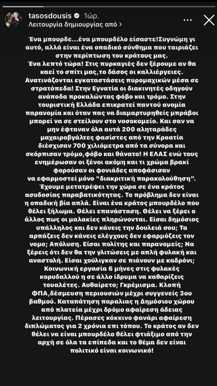 Κανείς δεν θα ξεχάσει όσα έγιναν στο γήπεδο της ΑΕΚ. Ξέσπασε ο Τάσος Δούσης, με αφορμή τα άγρια επεισόδια στη Νέα Φιλαδέλφεια, που είχαν ως τραγικό αποτέλεσμα τον θάνατο του 29χρονου Μιχάλη Κατσούρη. Ο Τάσος Δούσης, μέσα από την προσωπική του σελίδα στο Instagram, λέει τα πράγματα με το όνομά τους, σχετικά με το κράτος που μας κυβερνά.