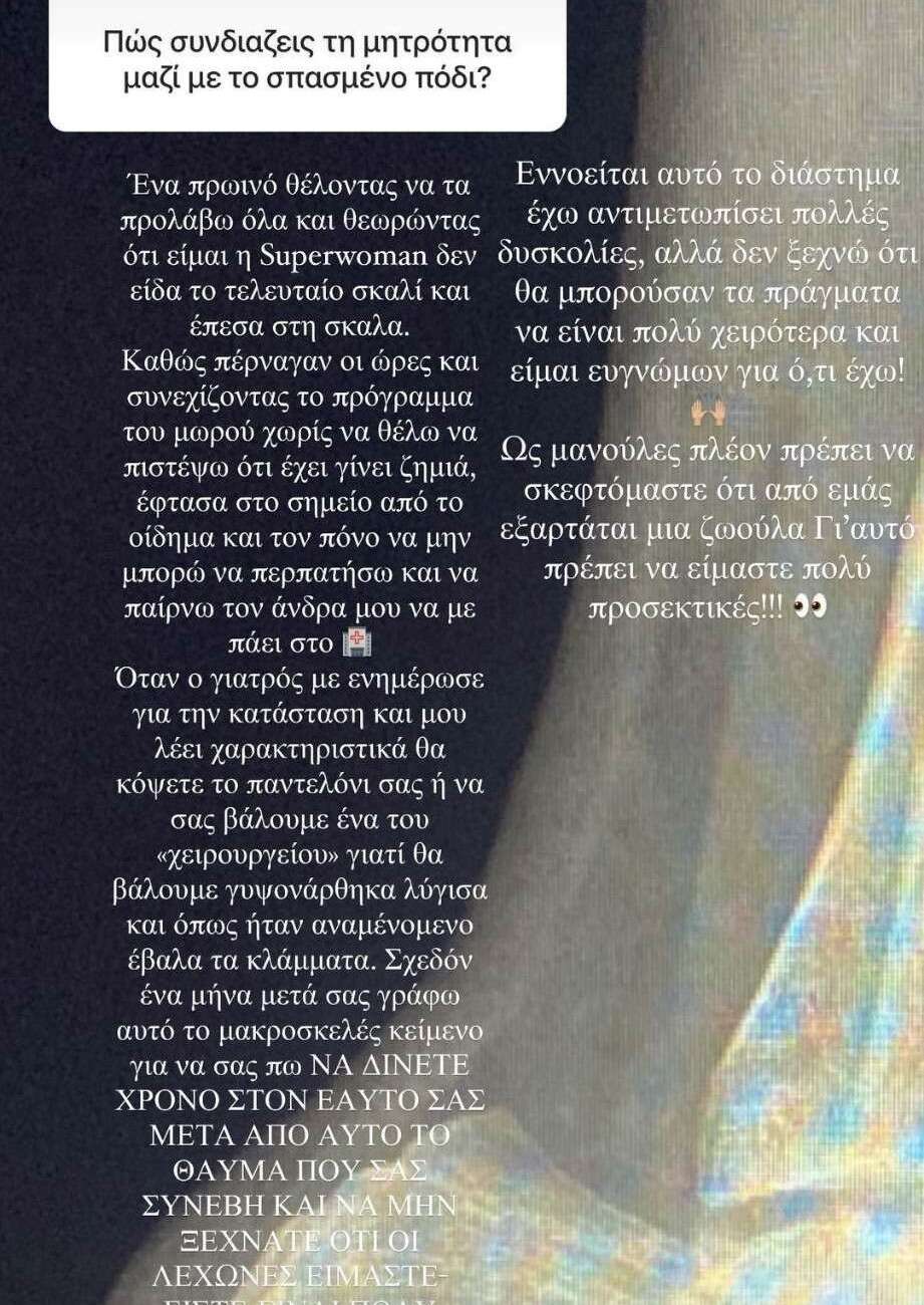 «Μετά το Doppler και για 2 μήνες περίπου περάσαμε διάφορα. Μόνο η πίστη με κράταγε δυνατή. Κάποια στιγμή που θα είμαι έτοιμη θα μιλήσουμε… Δεν θα την ξεχάσω εκείνη την ημέρα. Γενικά έχω ελάχιστες φωτογραφίες από τότε. Απλά παρέμενα στον καναπέ/κρεβάτι και προσευχόμουν να περάσει ο καιρός!».