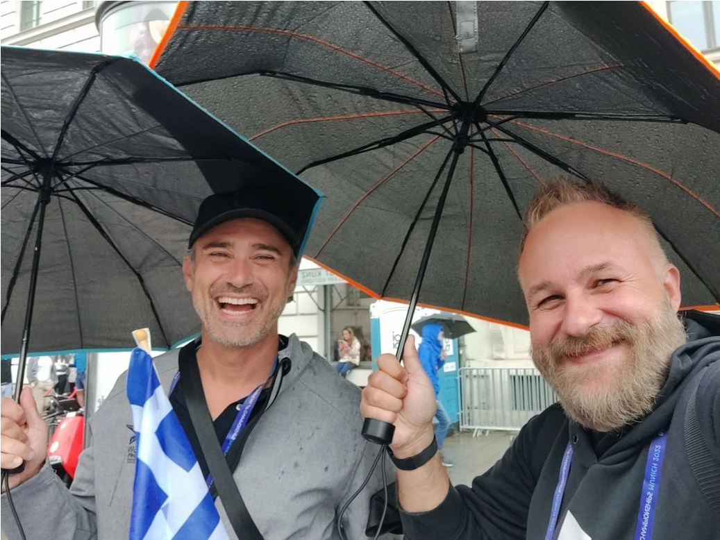 Αν υπάρχει κάποια διαφορετική φωτογραφία είναι των τελευταίων εβδομάδων με αφορμή το θέατρο… Νομίζω ότι υπάρχει και μία χαρούμενη φωτογραφία όταν πήρε η Αντιγόνη Ντρισμπιώτη το δεύτερο χρυσό μετάλλιο στο Μόναχο (γέλια). Μία φωτογραφία με τον κολλητό μου. Ευρωπαϊκό Πρωτάθλημα Στίβου, Αύγουστος 2022, Μόναχο