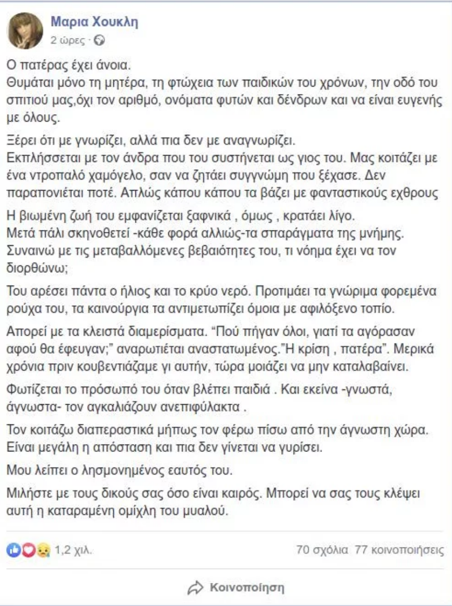 Αναφερόμενη στον πατέρα της που έχει διαγνωστεί με άνοια, η Μαρία Χούκλη με ανάρτηση που έκανε στο προφίλ της στο Facebook για την Γιορτή του Πατέρα βάζει τίτλο «Μου λείπει ο λησμονημένος εαυτός του».