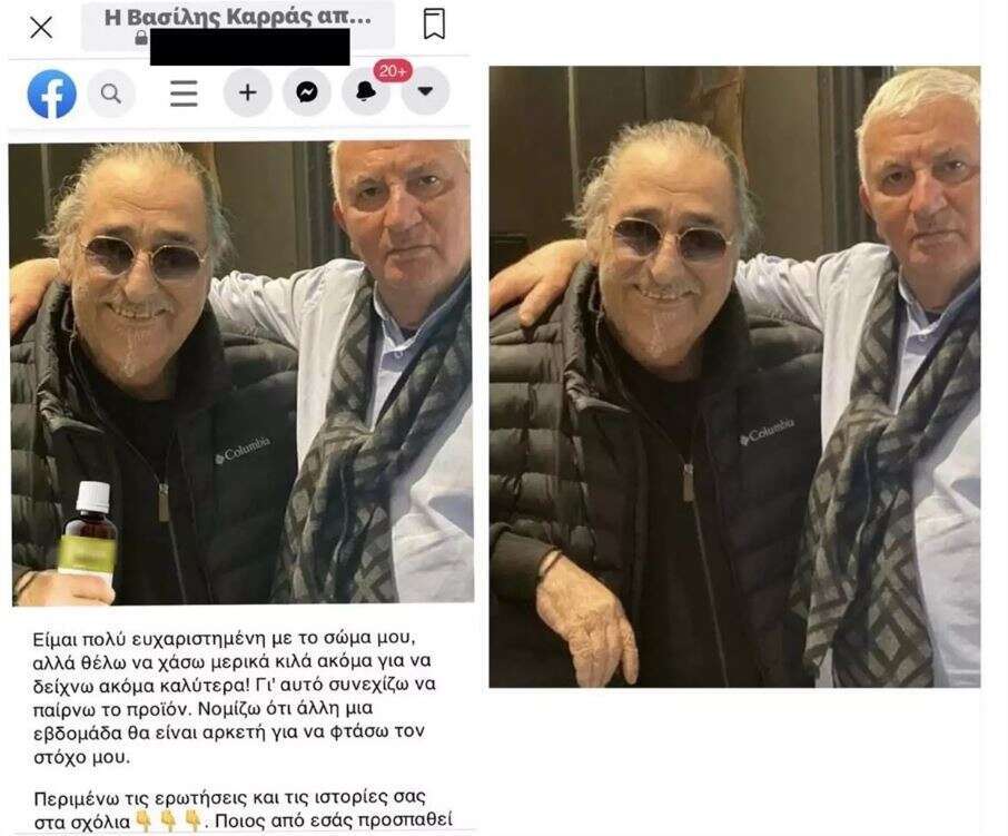 Η εν λόγω σελίδα, χωρίς τη σύμφωνη γνώμη του τραγουδιστή, εκμεταλλεύεται τα προσωπικά δεδομένα του για να προωθήσει ένα προϊόν αδυνατίσματος. Οι διαχειριστές της ανήρτησαν πλαστές φωτογραφίες του Βασίλη Καρρά για εμπορικούς σκοπούς, όπου απεικονίζεται να κρατάει στο χέρι του ένα προϊόν αδυνατίσματος.