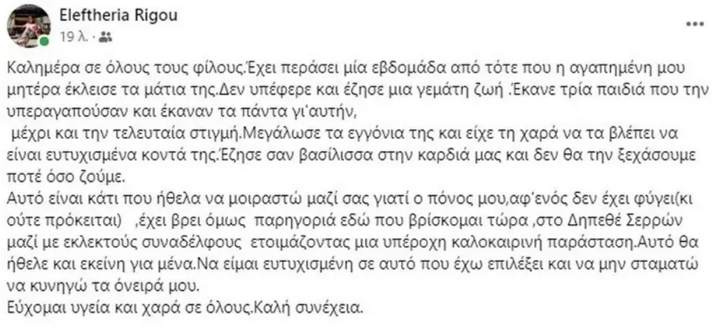 «Καλημέρα σε όλους τους φίλους. Έχει περάσει μία εβδομάδα από τότε που η αγαπημένη μου μητέρα έκλεισε τα μάτια της.