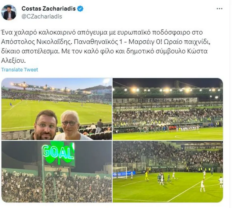 Σάλος έχει ξεσπάσει στα social media με αφορμή το «χαλαρό καλοκαιρινό απόγευμα» που πέρασε ο υποψήφιος δήμαρχος Αθηναίων Κώστας Ζαχαριάδης στο γήπεδο της Λεωφόρου Αλεξάνδρας, παρακολουθώντας τον αγώνα ανάμεσα στον Παναθηναϊκό και την Μαρσέιγ για τον γ’ προκριματικό του Champions League.