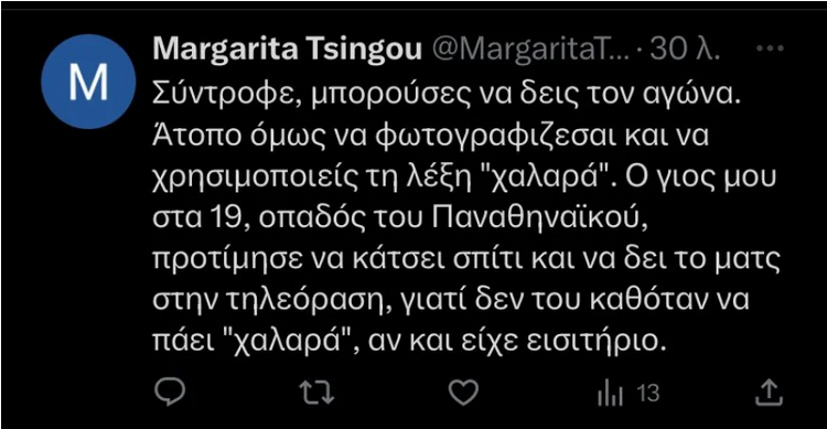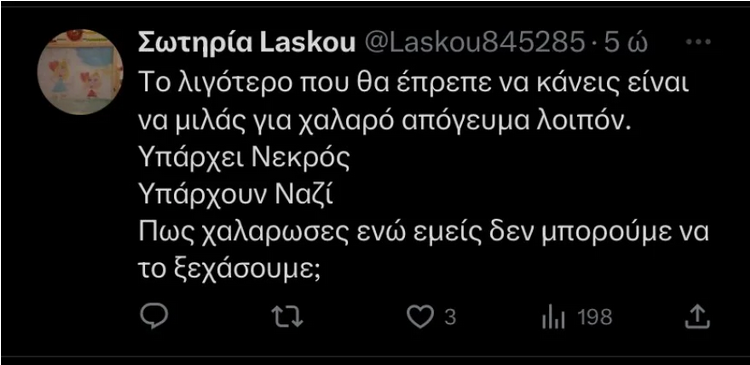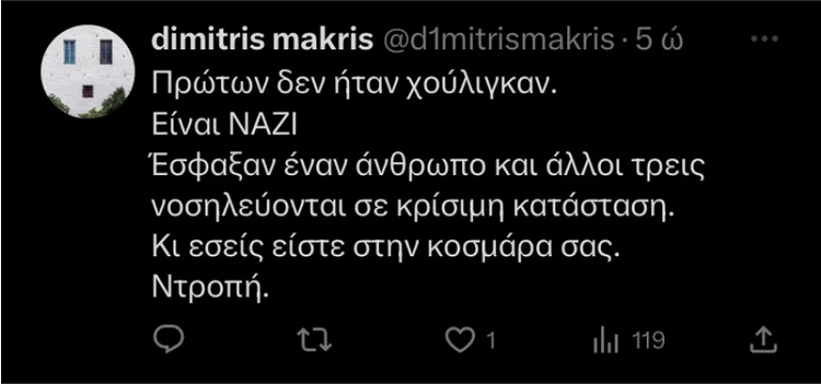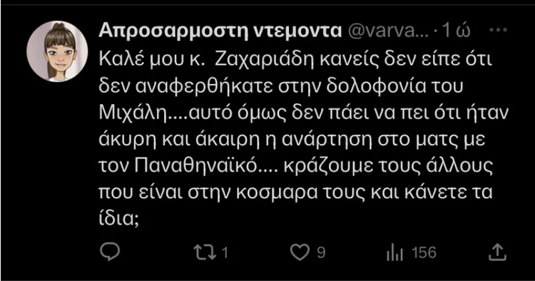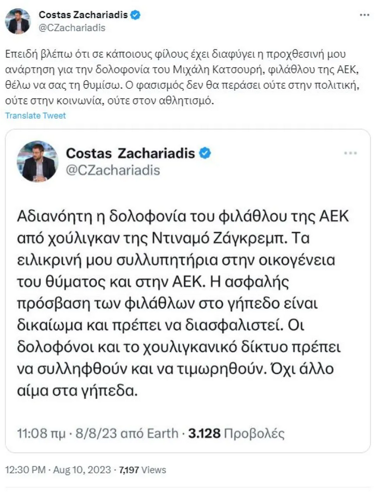 Λίγες ώρες μετά ο κ. Ζαχαριάδης θέλοντας να απαντήσει σε όσους επέκριναν το «χαλαρό απόγευμα» που πέρασε υπενθύμισε μία ανάρτηση που είχε κάνει το πρωί της Τρίτης σχετικά με την δολοφονία του 29χρονου οπαδού της ΑΕΚ. «Επειδή βλέπω ότι σε κάποιους φίλους έχει διαφύγει η προχθεσινή μου ανάρτηση για την δολοφονία του Μιχάλη Κατσουρή, φιλάθλου της ΑΕΚ, θέλω να σας τη θυμίσω. Ο φασισμός δεν θα περάσει ούτε στην πολιτική, ούτε στην κοινωνία, ούτε στον αθλητισμό», ανέφερε χαρακτηριστικά.