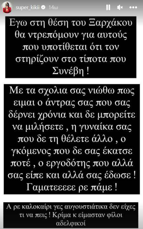 «Εγώ στη θέση του Ξαρχάκου θα ντρεπόμουν για αυτούς που υποτίθεται ότι τον στηρίζουν στο τίποτα που συνέβη. Με τα σχόλιά σας νιώθω πως είμαι ο άντρας σας που σας δέρνει χρόνια και δε μπορείτε να μιλήσετε, η γυναίκα σας που δε τη θέλετε άλλο, ο γκόμενος που δε σας έκατσε ποτέ, ο εργοδότης που άλλα σας είπε και άλλα σας έδωσε! Γαμ… ρε πάμε. Α ρε καλοκαίρι yes αυγουστιάτικα δεν είχες τι να πεις! Κρίμα και είμασταν φίλοι αδελφικοί», έγραψε χαρακτηριστικά η Super Κική.