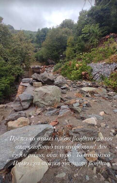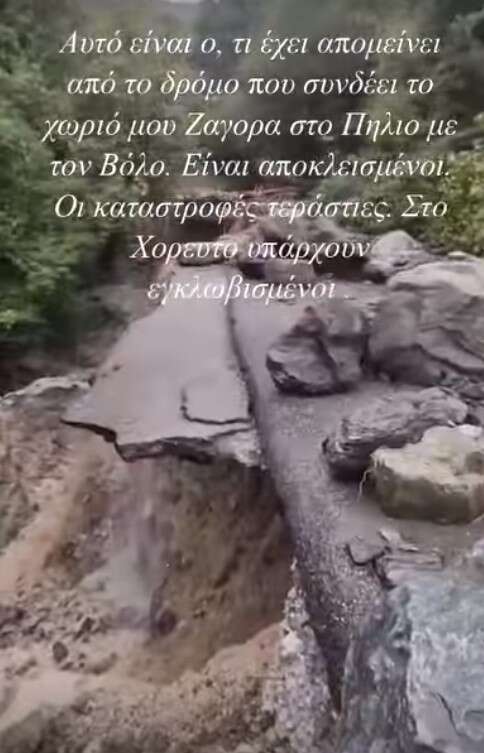 «Αυτό είναι ότι έχει απομείνει από το δρόμο που συνδέει το χωριό μου, Ζαγόρα στο Πήλιο με τον Βόλο. Είναι αποκλεισμένοι. Οι καταστροφές τεράστιες. Στο Χορευτό υπάρχουν εγκλωβισμένοι.», ανέφερε αρχικά η Βίκυ Βολιώτη μέσα από στόρι της.