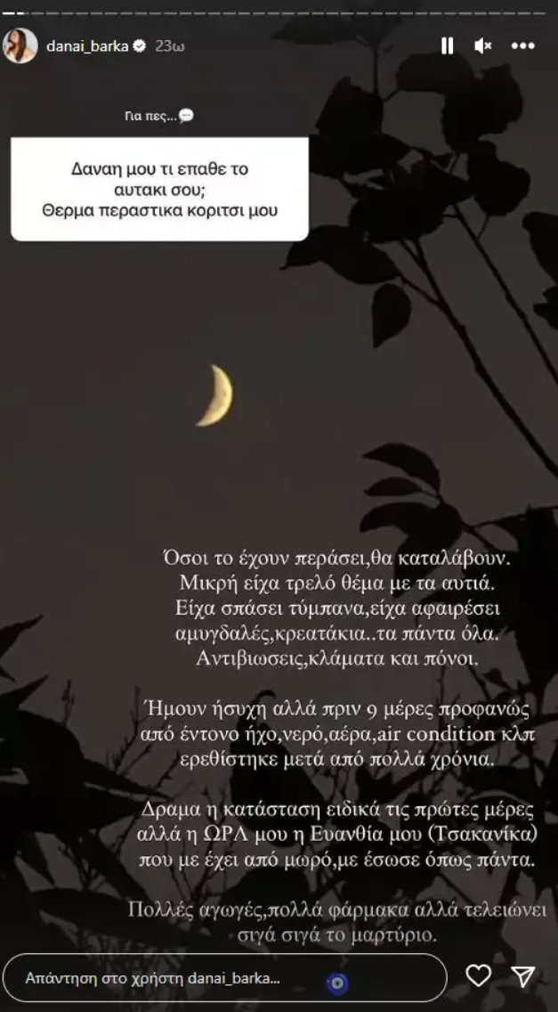 Η Δανάη Μπάρκα τις τελευταίες ημέρες ταλαιπωρείται από ένα πρόβλημα υγείας και είχε χάσει το 50% της ακοής της, τώρα είναι καλύτερα και δημοσίευσε και ένα σχετικό instastory.