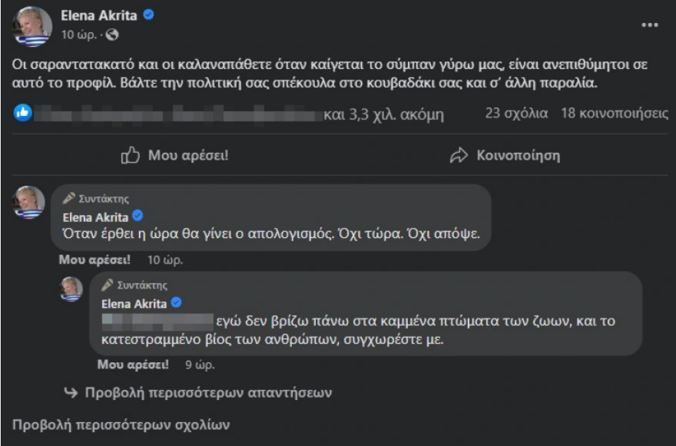 Η ίδια, βρίσκεται κοντά σε κάποιο από τα σημεία και ενημέρωσε τους φίλους της μέσα από τον προσωπικό της λογαριασμό στο Instagram ότι είναι καλά όμως δεν θα απαντήσει σε άλλα τηλεφωνήματα καθώς κρατά μπαταρία σε περίπτωση που γίνει κάτι και τη χρειαστεί.