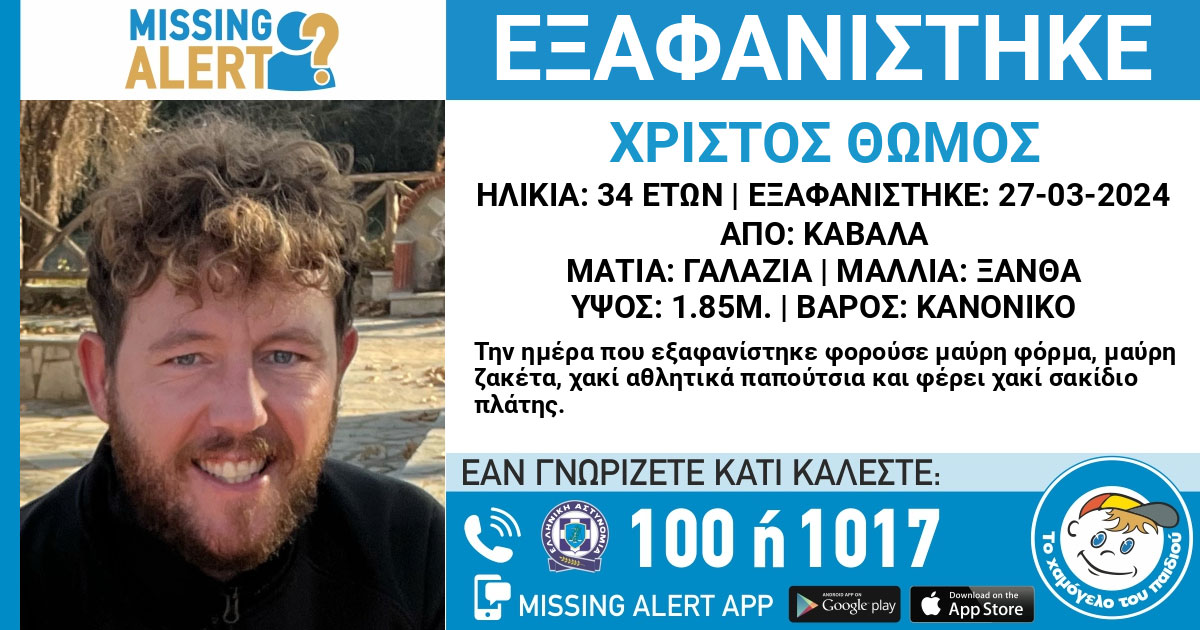 Ανακοίνωση για την εξαφάνιση του 34χρονου εξέδωσε και το «Χαμόγελο του Παιδιού» και προχώρησε στη δημοσιοποίηση των στοιχείων του κατόπιν αιτήματος της οικογένειας του, καθώς ενδέχεται να συντρέχουν λόγοι οι οποίοι θέτουν τη ζωή του σε κίνδυνο.