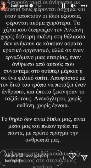 Αποφάσισε με τον δικό του τρόπο να πετάξει έναν άνθρωπο κι έπειτα ξεκίνησαν το ταξίδι τους. Ανενόχλητοι, χωρίς ευθύνη, χωρίς έγνοια. Το θηρίο δεν είναι δίπλα μας, είναι μέσα μας και πλέον τρώει τα πάντα με πρώτο πράγμα την ανθρωπιά μας. Άνθρωπος στη θάλασσα υπήρξε στη στεριά όμως πουθενά», έγραψε η ίδια στον προσωπικό της λογαριασμό ξεσπώντας!