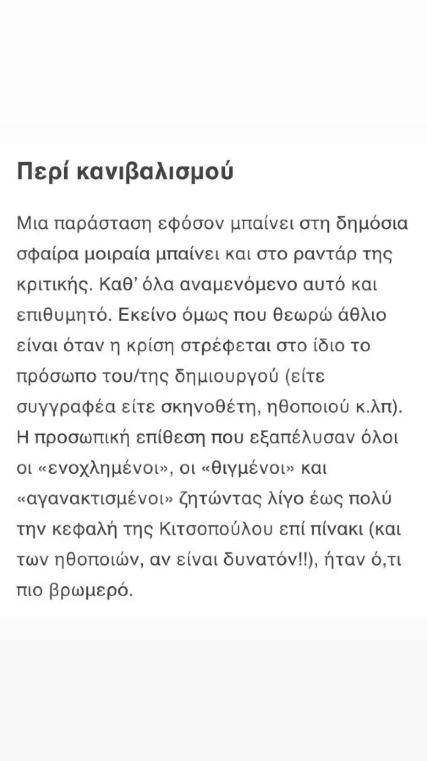«Το ξαναλέω: Δικαίωμα του καθενός να μην αρέσει η δουλειά της όποιας Κιτσοπούλου (ή η απόδοση των ηθοποιών). Δικαίωμα του καθενός να τη θεωρεί αυτή ή και τους συνεργάτες της μέτριους ή κατώτερους των προσδοκιών του και δεν ξέρω τι άλλο. Για θέατρο μιλάμε. Δεν είναι ποτέ μονόδρομος. Οι εκτιμήσεις είναι όπως ένα καρδιογράφημα. Πάνω-κάτω. Σχετικοί και άσχετοι μαζί. Ο καθένας με τα γούστα του, τα στάνταρ του, τις αγκυλώσεις του, την παιδεία ή την έλλειψη παιδείας του, και φυσικά τις κωλοτούμπες του (χθες υπέρ του τάδε, σήμερα κατά, αύριο, ε, ό,τι ήθελε προκύψει!). Τουλάχιστον αυτό το δικαίωμα, να έχεις άποψη και να την εκφέρεις χωρίς τον κίνδυνο τιμωρίας και εξοστρακισμού είναι η ευλογία του δημοκρατικού πολιτεύματος. Δεν είναι όμως δικαίωμα κανενός να προσβάλει την προσωπικότητα του άλλου. Είναι αισχρό, ανέντιμο και πέραν από κάθε έννοια δημοκρατίας και λογικής. Αυτό δεν είναι κριτική. Είναι κανιβαλισμός. Έλεος, κυρίες και κύριοι! Έτσι δεν χτίζεται ο ευεργετικός διάλογος.