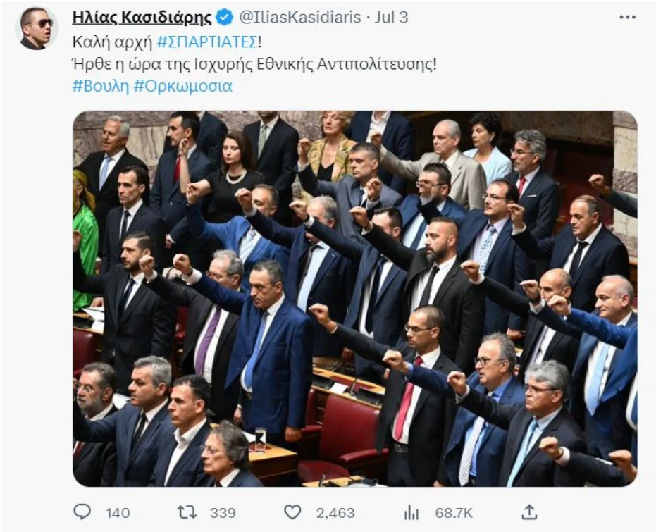 Σε νέα του ανάρτηση, ο Ηλίας Κασιδιάρης ευχήθηκε «καλή επιτυχία» στους Σπαρτιάτες μετά την ορκωμοσία στη Βουλή.