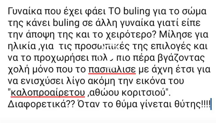 «Γυναίκα που έχει φάει το μπούλινγκ για το σώμα της, κάνει μπούλινγκ σε άλλη γυναίκα γιατί είπε την άποψή της και το χειρότερο; Μίλησε για τις ηλικίες, για τις προσωπικές της επιλογές και το προχώρησε πολύ πιο πέρα, βγάζοντας χολή. Μόνο που το πασπάλισε με άχνη έτσι για να ενισχύσει λίγο ακόμη την εικόνα “του καλοπροαίρετου, αθώου κοριτσιού”. Διαφορετικά;; Όταν το θύμα γίνεται θύτης», κατέληξε.