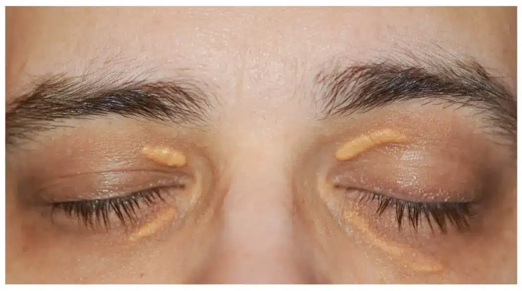 Τα ξανθελάσματα εμφανίζονται σαν κίτρινα εξογκώματα γύρω από τα μάτια, κυρίως στα άνω βλέφαρα. Αυτό μπορεί να είναι σημάδι υψηλής χοληστερόλης. Η συσσώρευση αυτών των εξογκωμάτων θα μπορούσε να υποδηλώνει αυξημένο κίνδυνο καρδιακής νόσου.