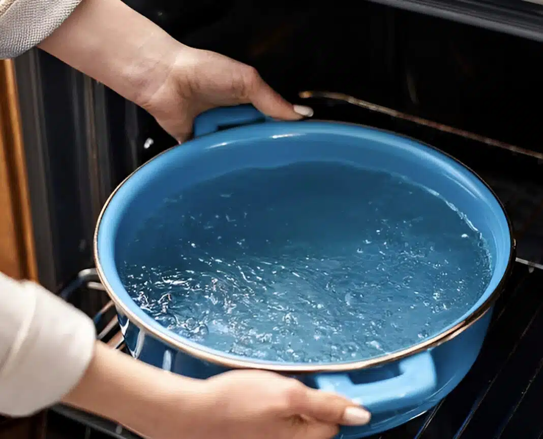Μόλις προθερμανθει ο φούρνος, τοποθετήστε το σκεύος με το νερό σε μια από τις μεσαίες θέσεις της σχάρας. Βεβαιωθείτε ότι είναι καλά τοποθετημένο ώστε να μην χυθεί. Κλείστε την πόρτα του φούρνου και αφήστε το νερό να αχνίσει για 20 με 30 λεπτά.