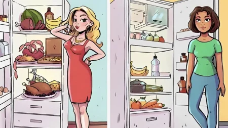 Ενώ η γυναίκα με το πράσινο πουκάμισο μπορεί να φαίνεται πιο πλούσια με την πρώτη ματιά -αφού αγοράζει φρούτα μόνο για το ψυγείο της και φαίνεται να τρώει συχνά έξω– η κατάσταση υποδηλώνει το αντίθετο.