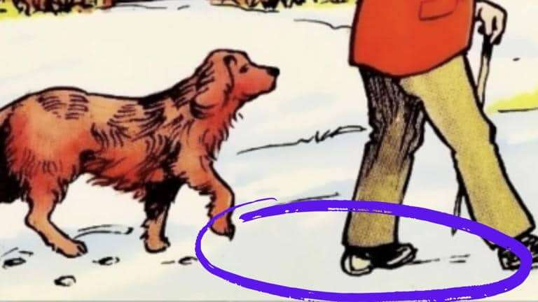 Η βασική λεπτομέρεια; Τα ίχνη στο χιόνι. Ενώ ο σκύλος έχει αφήσει αποτυπώματα από τις πατούσες του, ο ιδιοκτήτης δεν έχει αφήσει καθόλου ίχνη. Δεν υπάρχουν σημάδια από τα παπούτσια του στο χιόνι—ένα προφανές και μάλλον κραυγαλέο λάθος.