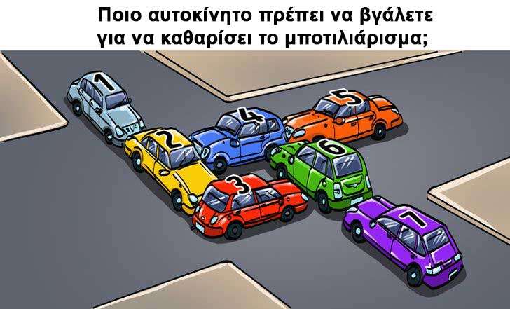Το παρακάτω τεστ IQ σας ζητάει να αναγνωρίσετε ποιο αυτοκίνητο πρέπει να απομακρυνθεί για να καθαρίσει το μποτιλιάρισμα. Στην εικόνα υπάρχουν 7 αυτοκίνητα και έχουν προκαλέσει κυκλοφοριακό κομφούζιο. Ωστόσο εάν ένα αυτοκίνητο απομακρυνθεί, τότε τα υπόλοιπα αυτοκίνητα θα είναι ελεύθερα να κινηθούν προς το δρόμο τους.
