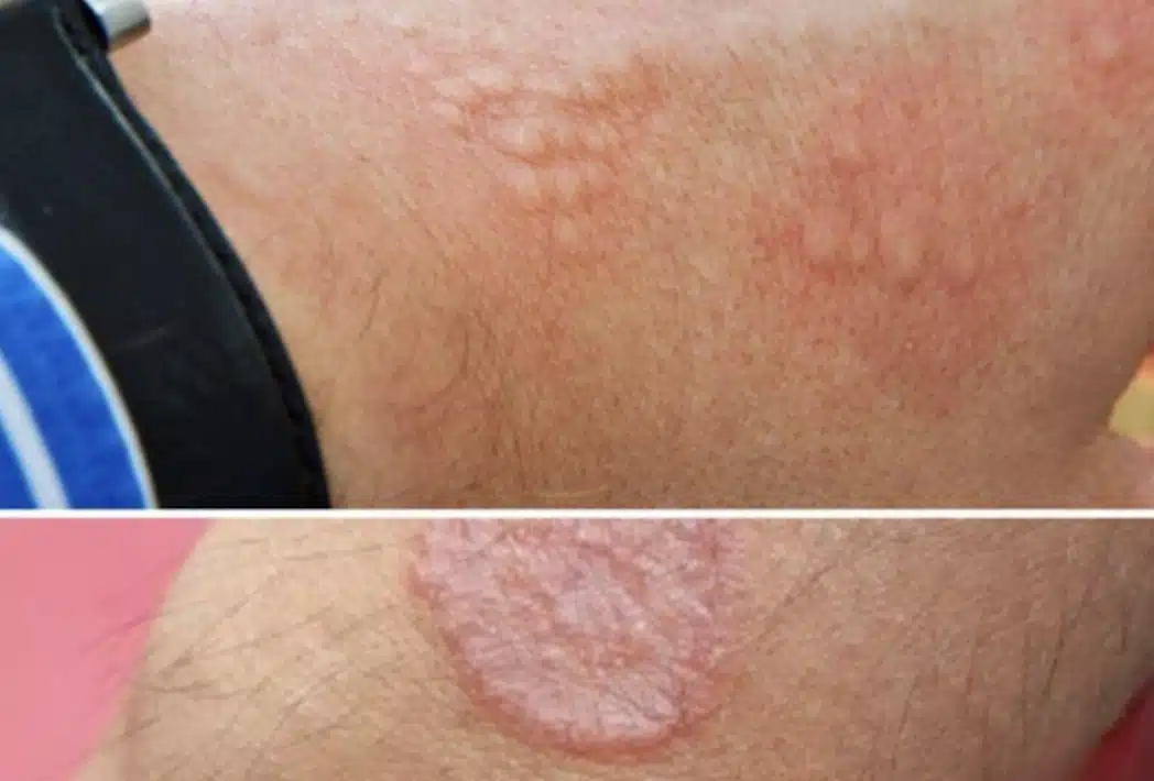 Εμφάνιση: Παρατηρείται μια περιοχή με εξάνθημα που μοιάζει με κνίδωση (κοινώς “πετάλες”) ή μικρές, ελαφρώς ανασηκωμένες κηλίδες και φουσκάλες (πομφούς), οι οποίες έχουν κοκκινωπό χρώμα.