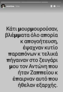«Κάτι μουρμουρούσαν βλέμματα όλο απορία κ απογοήτευση έψαχναν κυτίο παραπόνων κ τελικά πήγαιναν στο ζευγάρι μου τον Αντώνη που ήταν Ζαππείου κ έπαιρναν αυτό που ήθελαν εξαρχής», συνέχισε σε επόμενη ιστορία ο γνωστός σεφ.