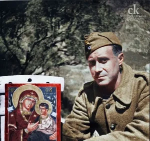 Ο διοικητής της μονάδας είπε σε έναν ανθυπολοχαγό να βγάλει τη συγκεκριμένη φωτογραφία. Η εικόνα που κρατά στα χέρια του ο Γ. Τσαρούχης απεικονίζει την Παναγία με το Χριστό και στο κάτω μέρος τα θαύματά της.