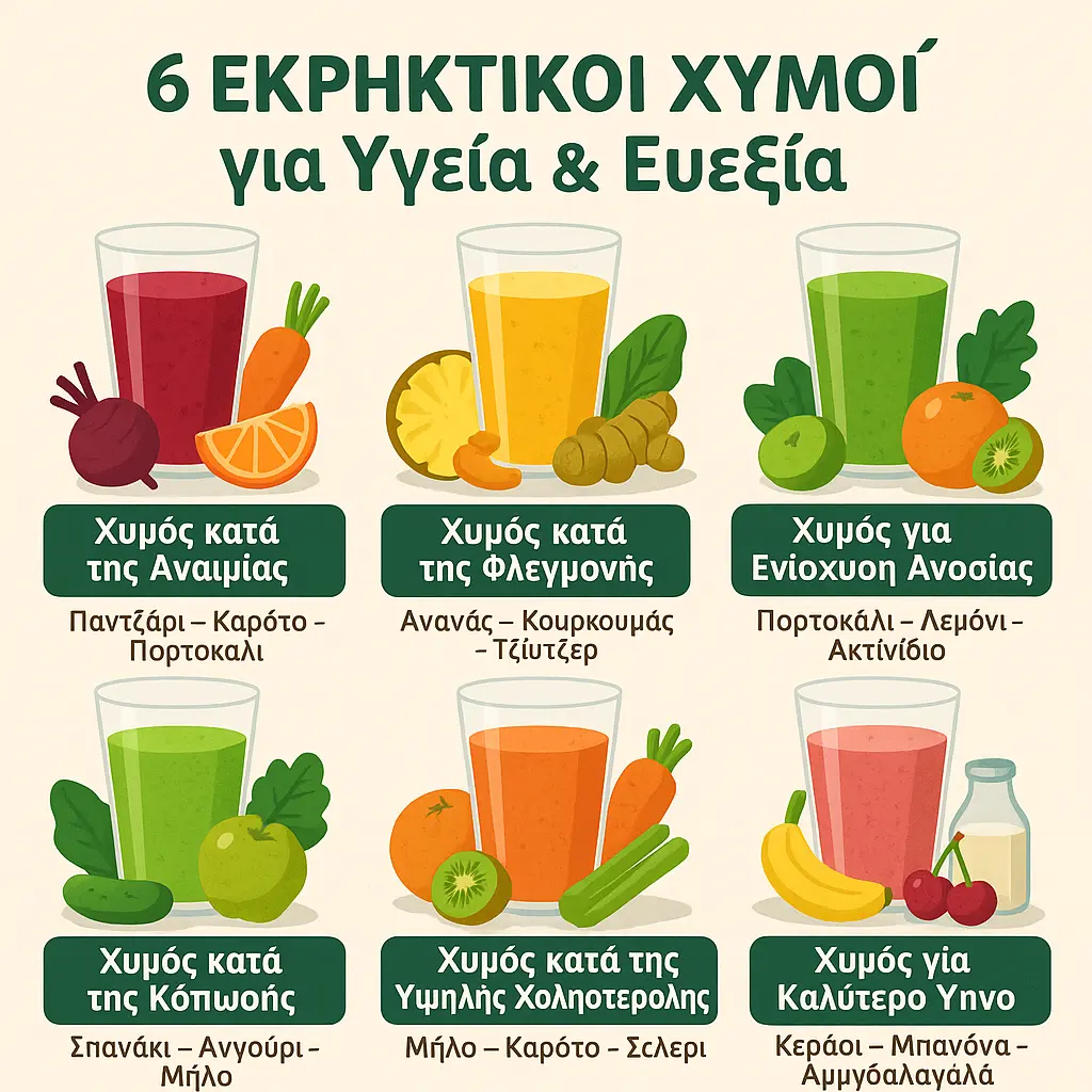 Η φύση μας προσφέρει συναρπαστικά “φάρμακα” σε ίσως άγνωστες, ζωηρές αποχρώσεις! Αυτοί οι 6 χυμοί είναι σχεδιασμένοι να δώσουν ώθηση στον οργανισμό σας, καταπολεμώντας αναιμία, φλεγμονές, κόπωση, χαμηλή άμυνα και υψηλή χοληστερόλη. Ξεχάστε τα βαρετά συμπληρώματα – δοκιμάστε αυτά τα φυσικά, γευστικά “εκρηκτικά” ποτά!