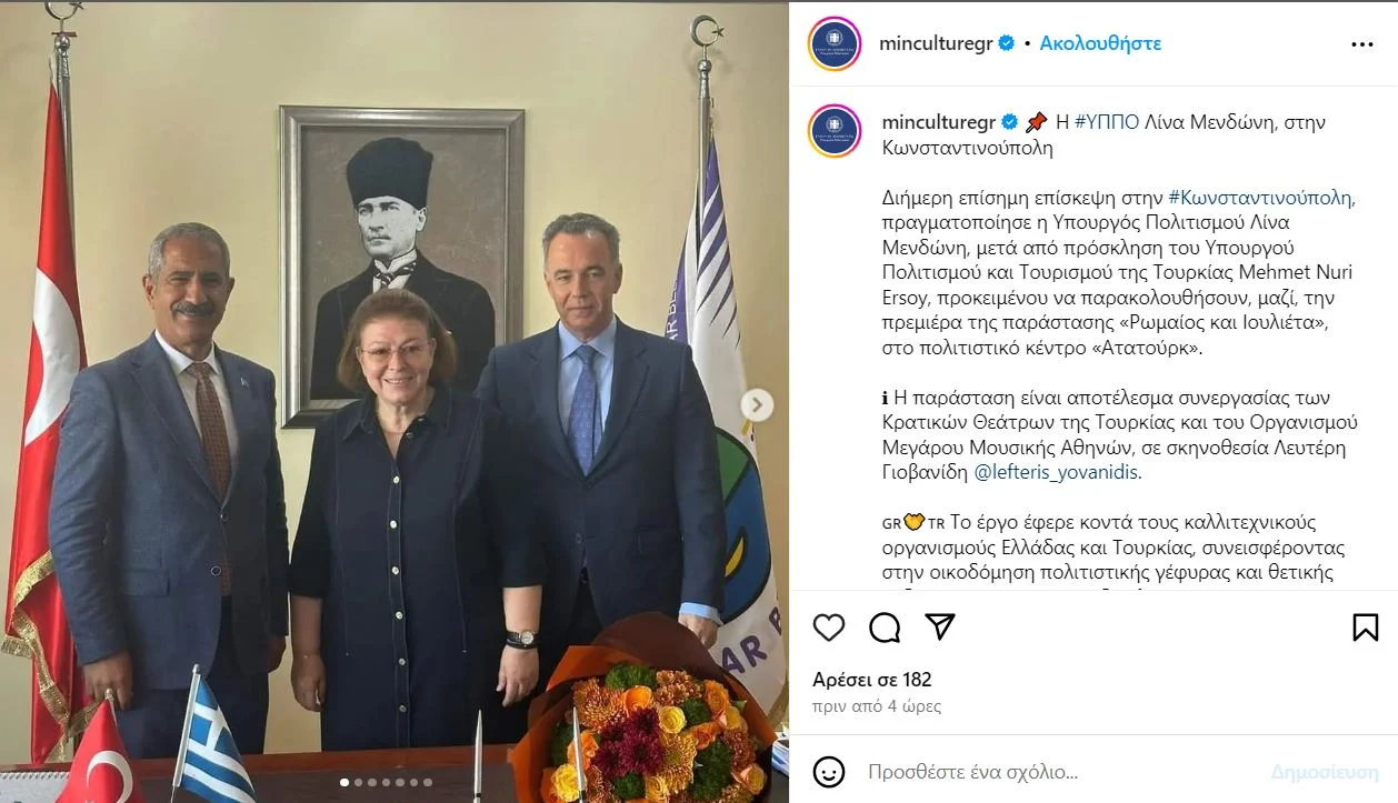 Σημειώνεται ότι η Λίνα Μενδώνη επισκέφθηκε την Κωνσταντινούπολη, για να παρακολουθήσει μαζί με τον Τούρκο ομόλογό της την πρεμιέρα της παράστασης «Ρωμαίος και Ιουλιέτα», μετά από συνεργασία των Κρατικών Θεάτρων της Τουρκίας και του Οργανισμού Μεγάρου Μουσικής Αθηνών, ωστόσο σε κανένα στιγμιότυπο δεν προβάλλεται η ελληνική σημαία.