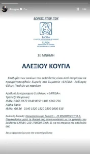Με νέες αναρτήσεις σήμερα, Καθαρά Δευτέρα 3 Μαρτίου, ο γιος του Αλέξη Κούγια ενημερώνει πως επιθυμία της οικογένειας είναι αντί στεφάνων να πραγματοποιηθούν δωρεές στο Σωματείο «Ελπίδα Σύλλογος Φίλων Παιδιών με Καρκίνο»