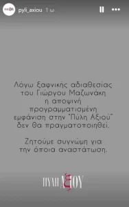 «Λόγω ξαφνικής αδιαθεσίας του Γιώργου Μαζωνάκη, η αποψινή προγραμματισμένη εμφάνισή του στην “Πύλη Αξιού” δεν θα πραγματοποιηθεί. Ζητούμε συγνώμη για την όποια αναστάτωση», εξηγεί η ανακοίνωση.