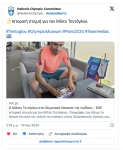Ο ίδιος ανταποκρίθηκε με μεγάλη χαρά, υπογράφοντας τον bib του (σ.σ.: τον αριθμό που φορούσε στη μπλούζα του κατά τη συμμετοχή του στους Ολυμπιακούς Αγώνες του Παρισιού). Πέρα από την υπογραφή του, ο Μίλτος Τεντόγλου έγραψε το όνομά του και την επίδοσή των 8,48 μ. που σημείωσε στον τελικό.