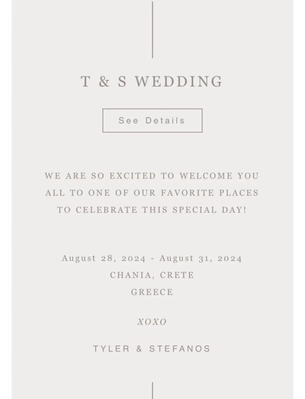 Όπως αναγράφεται στο προσκλητήριο, το γλέντι θα διαρκέσει τέσσερις ημέρες, από τις 28 μέχρι τις 31 Αυγούστου. Στο επάνω μέρος αναγράφονται τα αρχικά των δύο ανδρών, ενώ οι καλεσμένοι μπορούν να μπουν στο site με τις λεπτομέρειες του γάμου, χρησιμοποιώντας τον απαιτούμενο κωδικό.