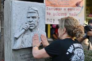 Ανάμεσά τους, η μητέρα του. Μόλις βρέθηκε στην οδό «Παύλου Φύσσα», όπως έχει μετονομαστεί η οδός Παναγή Τσαλδάρη στο Κερατσίνι, η Μάγδα Φύσσα φίλησε το μνημείο που είναι αφιερωμένο στο δολοφονημένο γιο της.