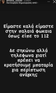 «Είμαστε καλά. Είμαστε στην Παλαιά Φώκαια όπως είπε το 112. Δε σηκώνω άλλα τηλέφωνα γιατί πρέπει να κρατήσουμε μπαταρία για περίπτωση ανάγκης», έγραψε χαρακτηριστικά στον προσωπικό της λογαριασμό στο Instagram η Αμαλία Καβάλη.